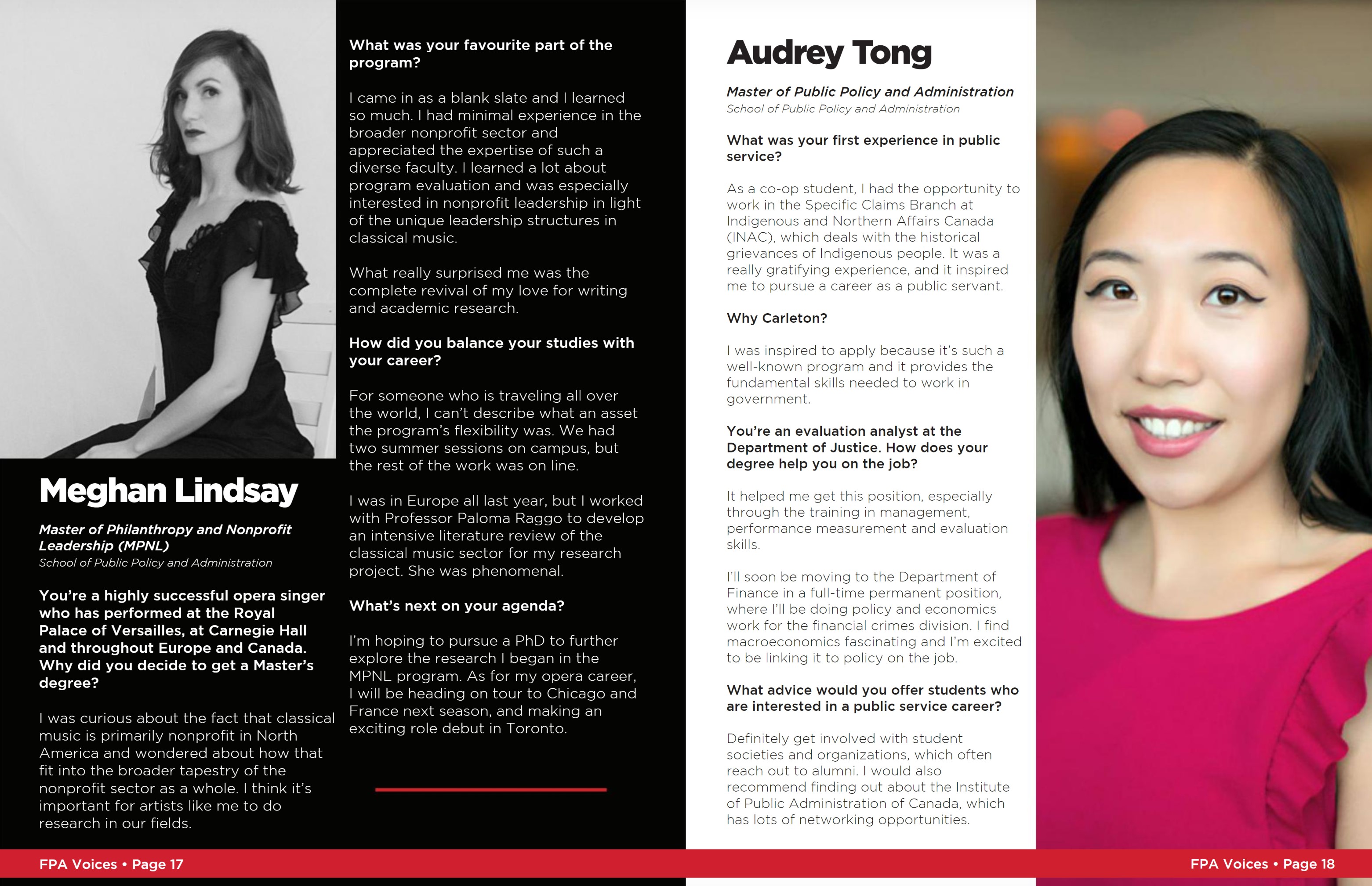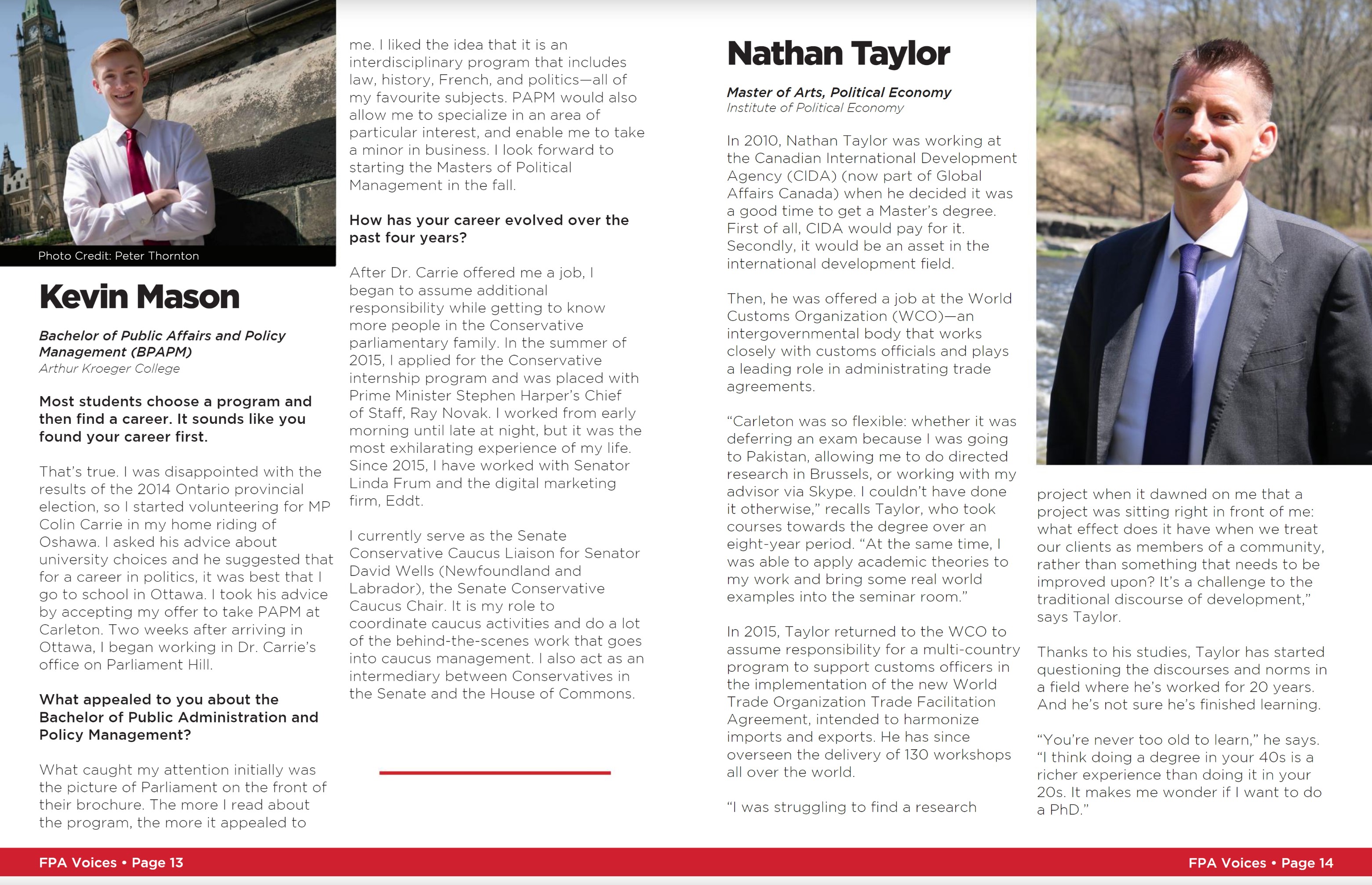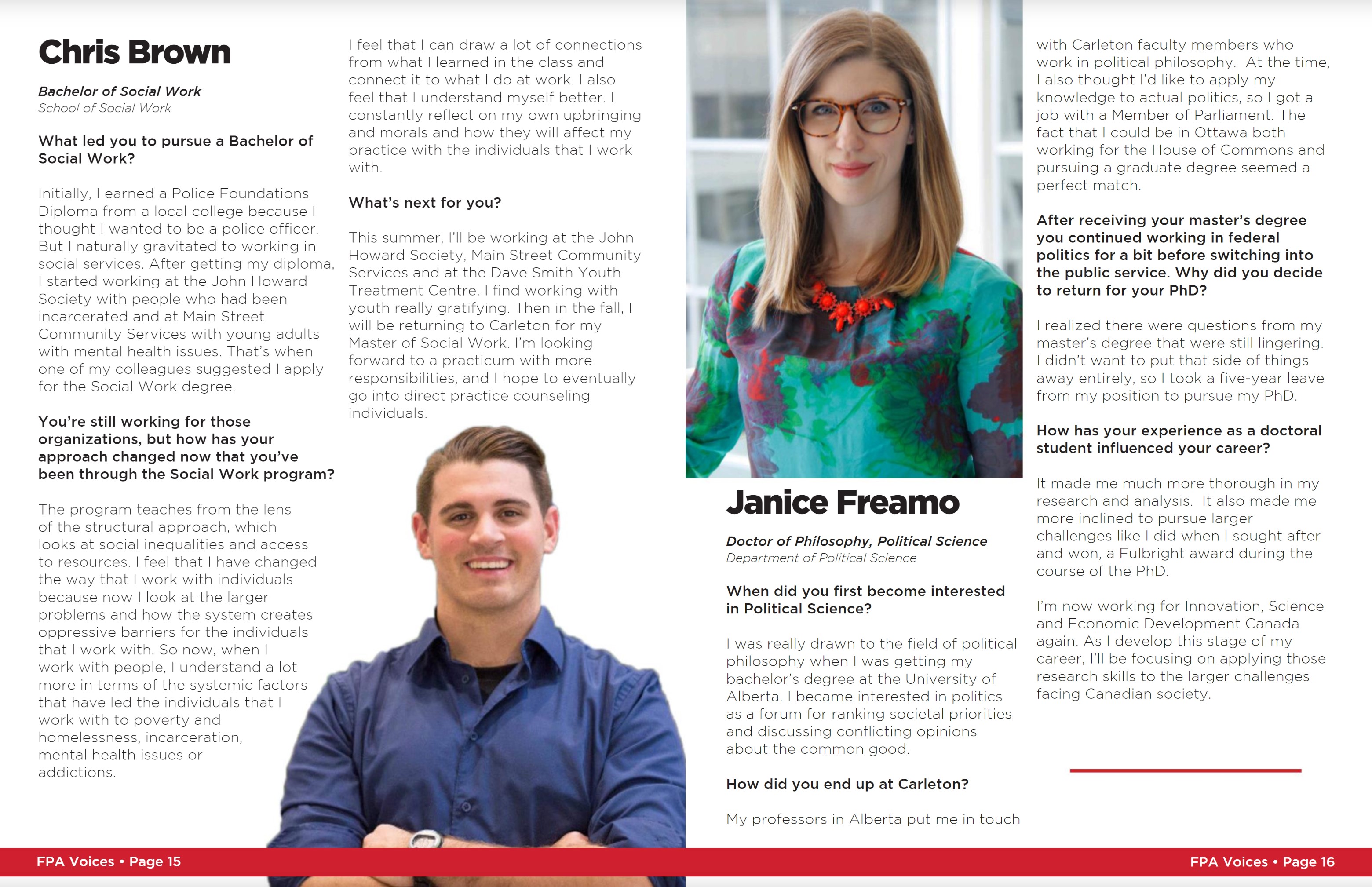 During my time at Carleton University I was responsible for producing, designing and photographing a number of department collateral pieces. One such project was the “FPA Voices” magazine for alumni of the Faculty of Public Affairs. You can see a sample of what I produced here.